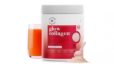 Glow Collagen is a premium supplement designed for both women and men. It contains pure marine collagen peptides, which are the building blocks for regenerating and renewing your skin. It has 25 servings and is priced at 2,133 INR.