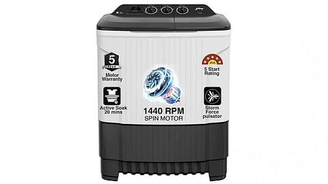 Its 5-star energy rating ensures reduced electricity consumption, and the 1440 RPM spin speed helps in faster drying. The machine features a Storm Force Pulsator, Active Soak, and a powerful 460 W Wash Motor, making it efficient for thorough cleaning.