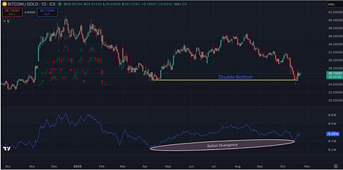 Meanwhile, Bitcoin is showing strength against the yellow metal, forming what analysts describe as a potential market bottom.