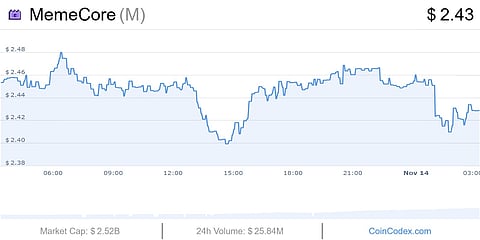 MemeCore is trading near $2.45, with a market capitalization around $2.5 billion as per data from Coincodex, situating it in the higher-risk, higher-reward segment of the market.