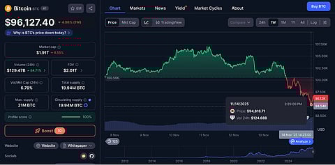 Bitcoin price is near $96,200 after a fast drop from $105,000 and about 20% down in two weeks. The move from the $126,000 peak left a wide band.