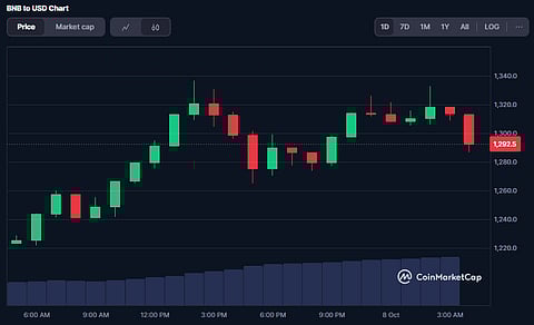 BNB soared by over 8% in 24 hours, going from $1,222 to $1,331 at its peak earlier today. Since then, its price dipped to around $1,292, which is where it sits at the time of writing.