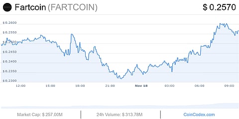 Fartcoin is trading around $0.2570 at the time of writing, backed by a market cap close to $260 million, with nearly all of its supply already in circulation. This transparency makes valuation easier for traders, allowing them to assess price action without uncertainties tied to future token releases. As a result, interest remains steady even as broader market momentum shifts.