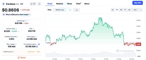 As of September 15, Cardano was trading at $0.8575 after a 5.92% drop over the past week. Cardano’s 7-day price charts also show a 0.6% fall.