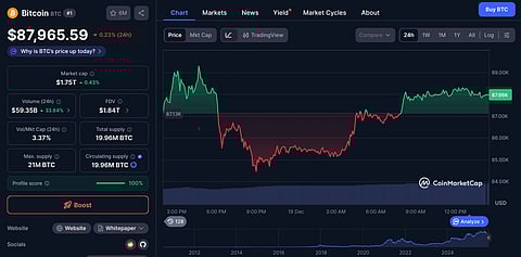 Bitcoin is trading in a tight range today as the coin hovers around a stable support zone as market participants await the next macro catalyst. According to CoinMarketCap, the price of Bitcoin is at almost $88,000 with a market cap value of over $1.7 trillion, indicating strength but low short-term upside.