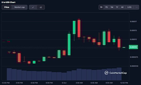 In the last 24 hours, 8 saw its price go up 2%, initially climbing from $0.000054 to $0.000183, only to then drop again to $0.00010, which is where it sits at the time of writing.