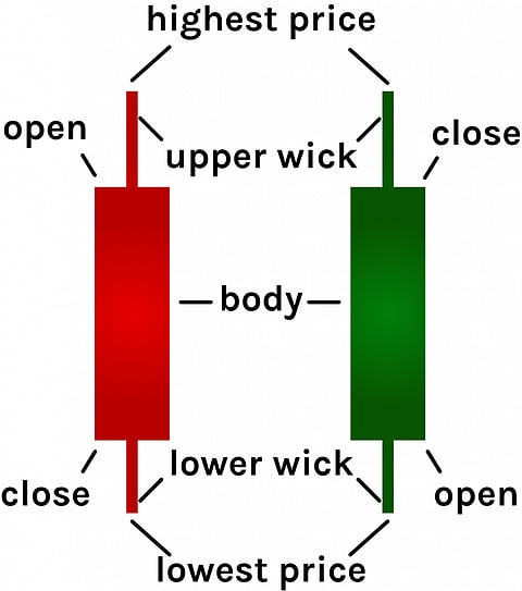 Each candlestick is the representation of a specific time frame (1 minute, 1 hour, or 1 day) and generally consists of three parts: