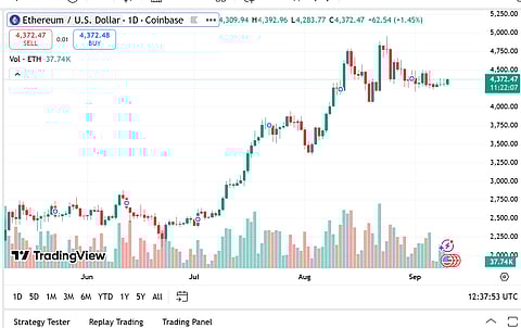Ethereum's price is currently $4,372.47, having fallen by 0.38% over the last day, with a market capitalization of $523.11 billion. Its trading volume fell by 10.13% to $29.66 billion.