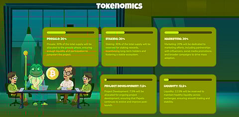 The tokenomics are built to reward holders through staking and through trading volume that will route back into PEPETO in 2026