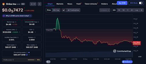 According to CoinMarketCap, Shiba Inu (SHIB) is currently trading at approximately $0.000007472 per token. At this price level, SHIB carries a real-time market capitalization of around $4.59 billion, confirming its position as a large-cap meme asset rather than an early-stage speculative play.