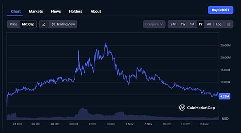 GHOST also has one of the best performances of new privacy coins. Following its launch in late October, the coin's market cap surged from around $1 million to over $26 million. The subsequent market dip corrected its trajectory, but not by much, leaving it at around $4.2 million. This low valuation increases the coin’s appeal for traders seeking up-and-coming tokens.