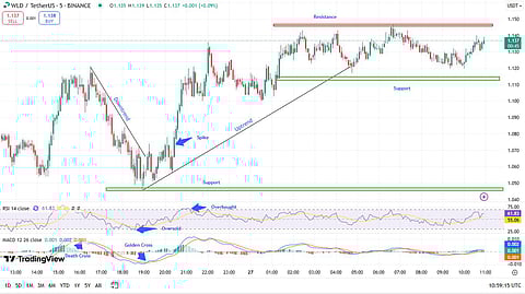 Are you considering buying WLD and wondering if this is the right time to invest? The chart indicates that WLD is currently testing a key resistance level near $1.145 after bouncing from strong support around $1.114. The recent price action shows an earlier downtrend that led to a sharp spike near support, followed by a steady uptrend. The RSI is at 61.83, approaching overbought territory, suggesting growing bullish momentum but also the potential for a pullback. The MACD recently had a golden cross, indicating a bullish signal, but a prior death cross suggests caution. If WLD breaks above resistance, further upside movement could follow, but a rejection might lead to another retest of the support zone.