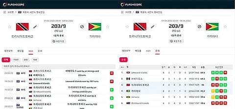 하지만 외국산 플래시스코어에서는 이렇게 크리켓 북중미 챔피언십 리그 같은 한국인은 쳐다도 안보는 잡리그 잡경기의 데이터까지 친절하게 한국어로 완벽하게 번역해주는 모습을 확인할 수 있습니다.