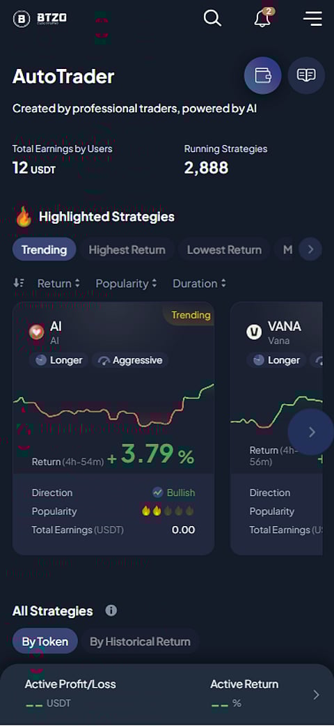 AutoTrader is the smart trading assistant of BTZO that enables users to carry out automatic trading plans without needing technical skills. The feature offers pre-configured plans devised by experts to help investors earn money from market trends 24/7.