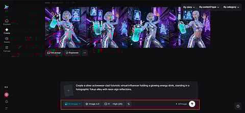 Let's say you write: a silver activewear-clad futuristic virtual influencer holding a glowing energy drink, standing in a holographic Tokyo alley with neon sign reflections.