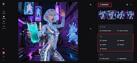 Once your image is finished, use Dreamina's AI editing tools: retouch to enhance details, expand to reveal a scene, remove to tidy up, and inpaint to add things. Once you're satisfied with the output, click "Download" to save it. You now have a visual set for campaigns, concept decks, or virtual influencer partnerships.