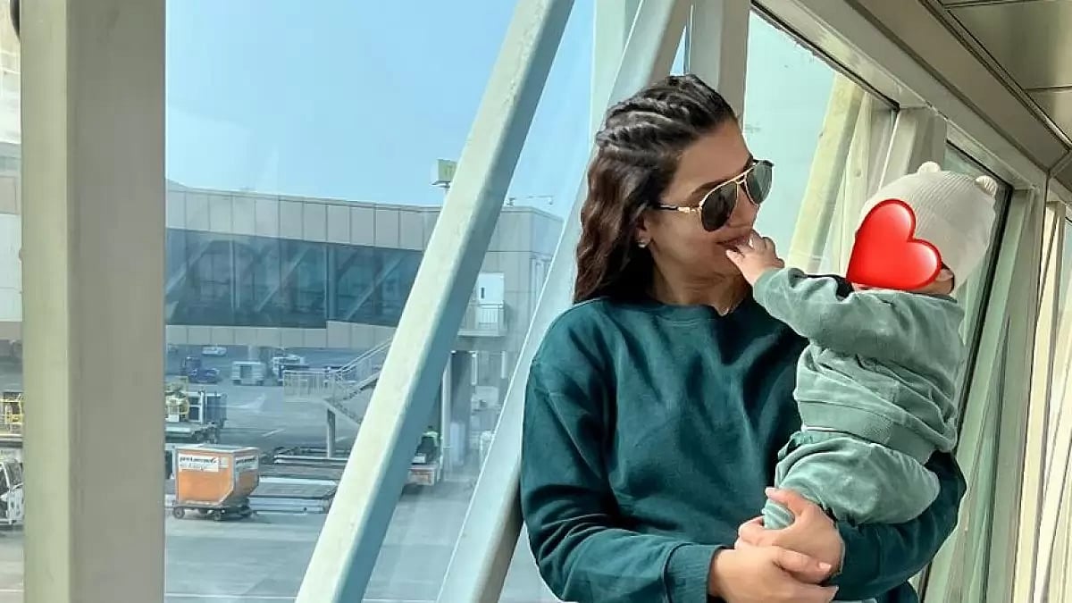 Gauahar is holding her baby boy in her arms, who is also wearing a matching co-ord set, paired with a beanie cap. The actress has not revealed the face of her child, and is seen kissing his hand.