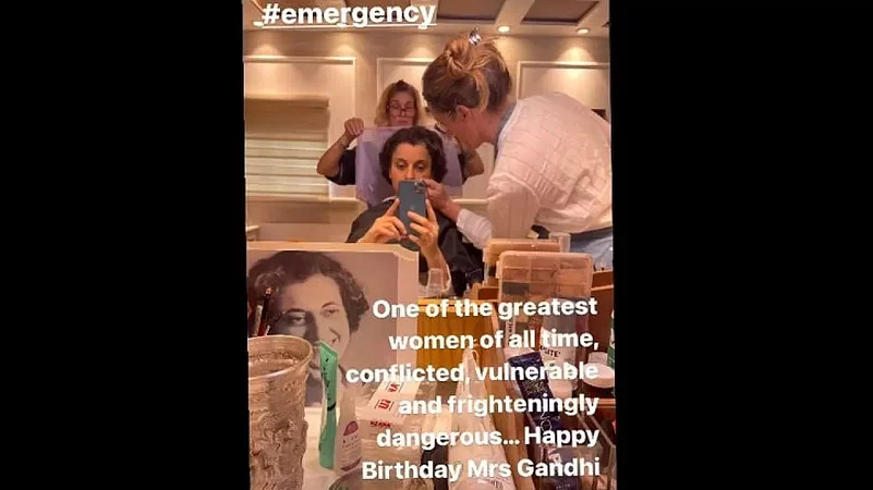 Kangana also shared a picture of herself from her make-up session in her stories. In the picture, one can also see an image of Indira Gandhi placed next to the mirror for make-up reference.