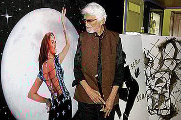Crore contact: M.F. Husain admires a Madhuri cutout