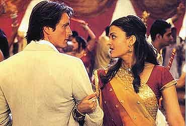 Here Aishwarya, such as she is, seems to fit the script, such as it is. She never gets past that 'look-at-doe-eyed-me' look. She rode a chariot that her admirers made for her when she became Miss World, and she hasn't gotten off it yet. She looks afraid that a real expression would mark her as a woman of the world rather than the lady on the chariot. Her expressions seem to halt in the early stages of formation; who knows which particular look might trap her in an unflattering snapshot? She travels the world a prisoner of her facial paint.