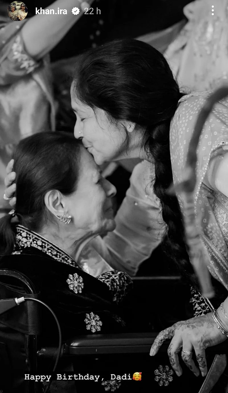 Ira, also shared an adorable picture of her grandmother from her wedding with Nupur Shikhare. In the image, Ira’s mother-in-law Pritam Shikhare was seen kissing her on the forehead. “Happy Birthday Dadi”, wrote Ira with a red heart emoji.