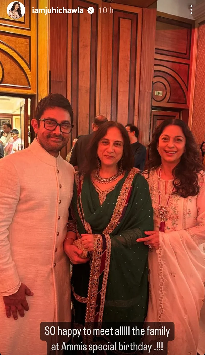 On Thursday, June 13, actor Aamir Khan's mother, Zeenat Hussain turned 90. To mark the special occasion, the entire Khan family hosted a special bash for her. Several stars attended the party including actress Juhi Chawla. Taking to her Instagram stories, Juhi shared a priceless pic from the party.