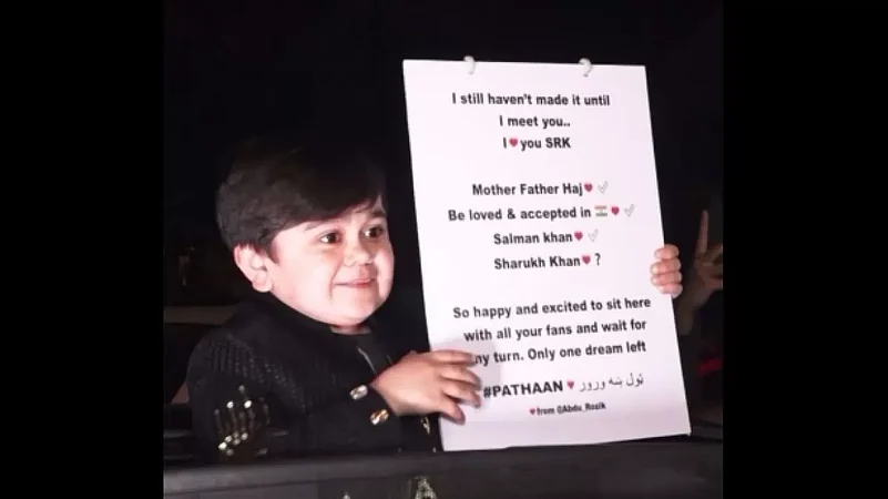 In a picture going viral on social media, Abdu was seen standing through the sunroof of a car and wearing a placard around his neck which said: "I still haven't made it until I meet you. I love you Shah Rukh Khan. So happy to sit here with all of your fans and wait for my turn. Only one dream left. Pathaan."