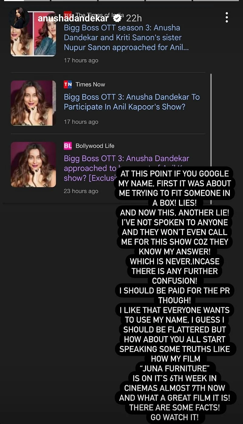 Taking to her Instagram Stories, Anusha Dandekar shared a screenshot of news articles that mentioned that she would be participating in ‘Bigg Boss OTT 3.’ She addressed the claims of her participating in the Anil Kapoor show and also reacted to ‘Heeramandi’ actor Jason Shah’s comments. She mentioned that she shuns headlines to distance herself from former relationships and fake reports.