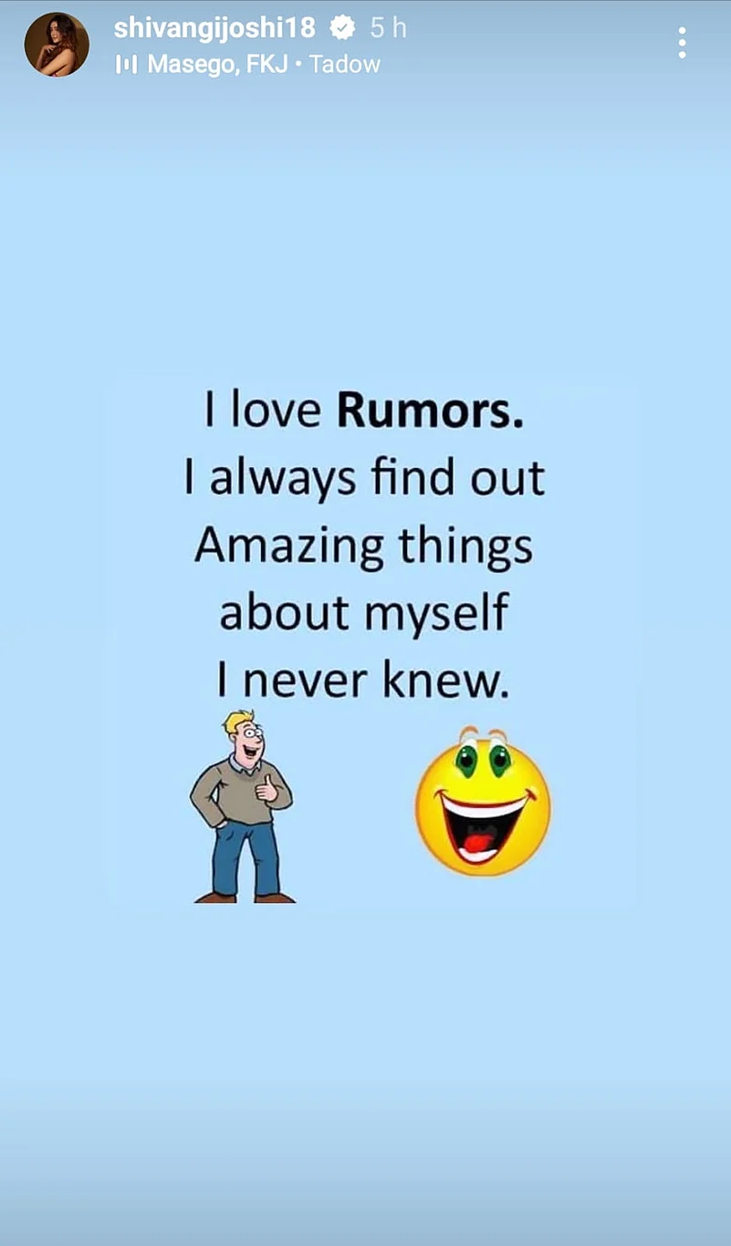 Indirectly reacting to the engagement reports Shivangi shared a cryptic post on her Instagram story which read, "I love rumours. I always find out amazing things about myself I never knew (sic)."