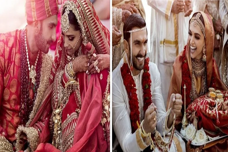 Deepika looked resplendent on both occasions, dressed in Sabyasachi Mukherjee ensembles rooted in tradition as she chose red and gold as her primary colours. For the North Indian style wedding, Deepika's head was covered with an ornate dupatta with the words 'Sada Saubhagyavati Bhavah' embroidered on it, while Ranveer matched up in a colour co-ordinated sherwani.