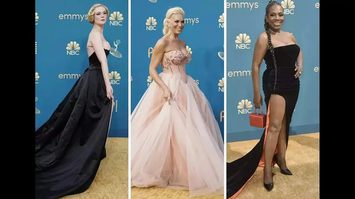 Waddingham, from "Ted Lasso," showed off her comfy white shoes beneath her corseted strapless pink look. Fanning, her hair in a pinned-back bob, said she wanted to honour the creatives on her show that provided her with her first Emmy nod. Fanning's look was black and pink, embellished at the chest.