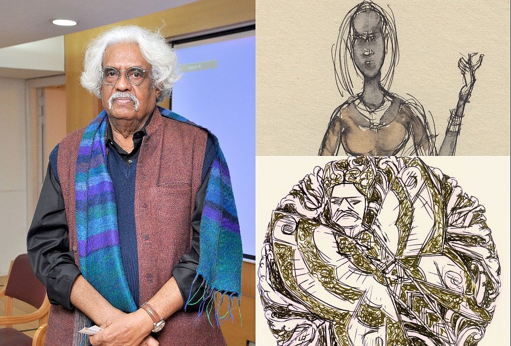 Ramachandran says, “There are also studies of the murals I executed at Gandhi Darshan and the Maurya Sheraton hotel. Like pages from a diary of everyday life, I have also recorded myself and my wife in comical, satirical and distorted images. I am not ashamed of making fun of others as well as myself. So there are some recent self-portraits which are the records of an old man looking back at his long career as an artist with no regrets to have such an rewarding life.”