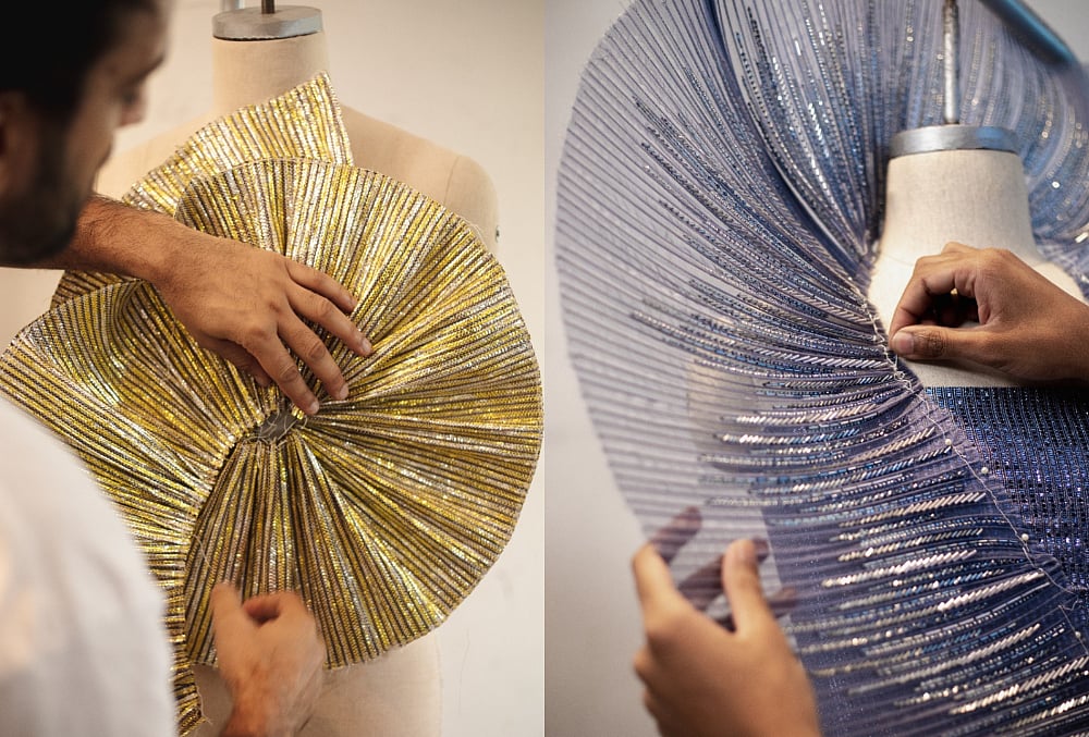 Definition and precision are seen in the sharp lines and edges across the endless forms and silhouettes - echoing the boundless underwater. Ranging from couture, demi-couture and hinting towards ready to wear, the collection meets the moment - as new glamour makes its debut questioning what is casual and what is over the top. Digital renditions and fabric research emulate a new aesthetic, drawing elements from the incessant aquatic life, coral, jellyfish and fantasy creatures.