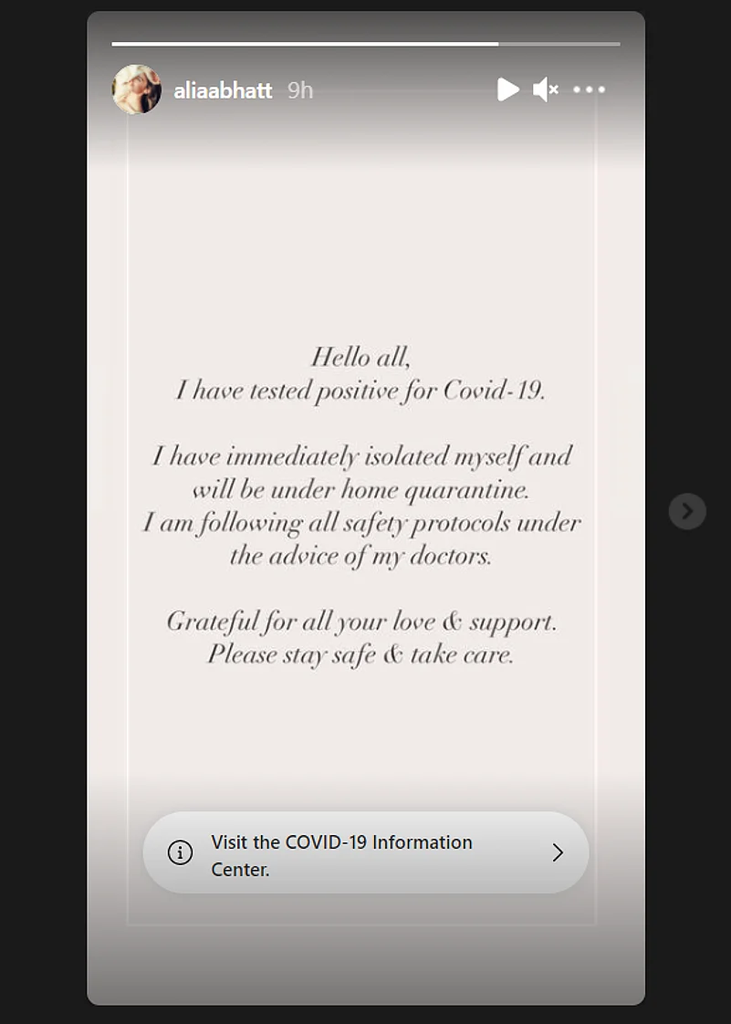 Bollywood actor Alia Bhatt on Friday informed her fans that she has tested positive for Covid-19 and is under home quarantine.