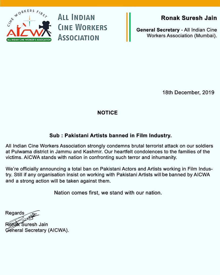 All Indian Cine Workers Association strongly condemns the brutal terrorist attack on our soldiers at Pulwama district in Jammu and Kashmir. Our heartfelt condolences to the families of the victims. AICWA stands with the nation in confronting such terror and inhumanity. We're officially announcing a total ban on Pakistani Actors and Artists working in Film Industry. Still if any organisation insist on working with Pakistani Artists will be banned by AICWA and a strong action will be taken against them. Nation comes first, we stand with our nation,ÂÂÂÂÂ the notice read.