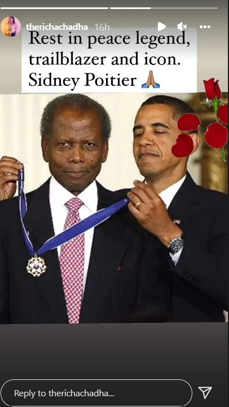 Actress Richa Chadha took to her Instagram story and called Poitier a legend, trailblazer and an icon.