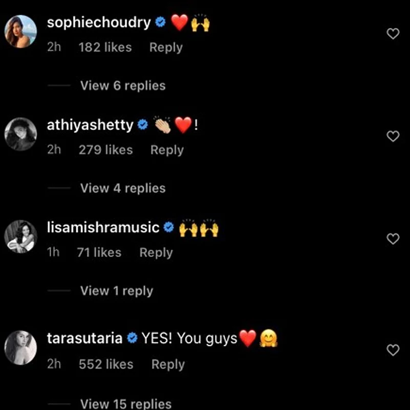 Several celebrities like actress Athiya Shetty, actress Tara Sutaria and singer Lisa Mishra commented on Kapoor's post with their share of good wishes for the couple. Here's a glimpse of the same: