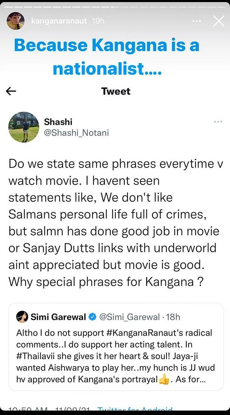 “Altho I do not support #KanganaRanaut’s radical comments..I do support her acting talent. In #Thailavii she gives it her heart & soul! Jaya-ji wanted Aishwarya to play her..my hunch is JJ wud hv approved of Kangana’s portrayalThumbs up. As for @thearvindswamy he is MGR reincarnate,” Simi’s tweet read.