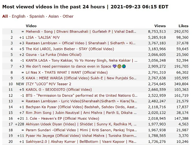 With over eight million views in the last 24 hours, ‘Mehendi’ takes the top spot. Kpop singer Lisa’s recently released single ‘LALISA' M/V’ was in the second spot, while Jubin Nautiyal and Asees Kaur’s song ‘Raataan Lambiyan’ was at the number third spot.