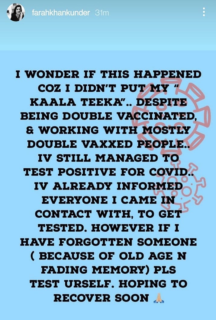 Popular Bollywood filmmaker-choreographer Farah Khan Kunder has tested positive for Covid-19. The filmmaker took to Instagram and made the announcement, while also asking those who were in close proximity with her, to get tested as well.