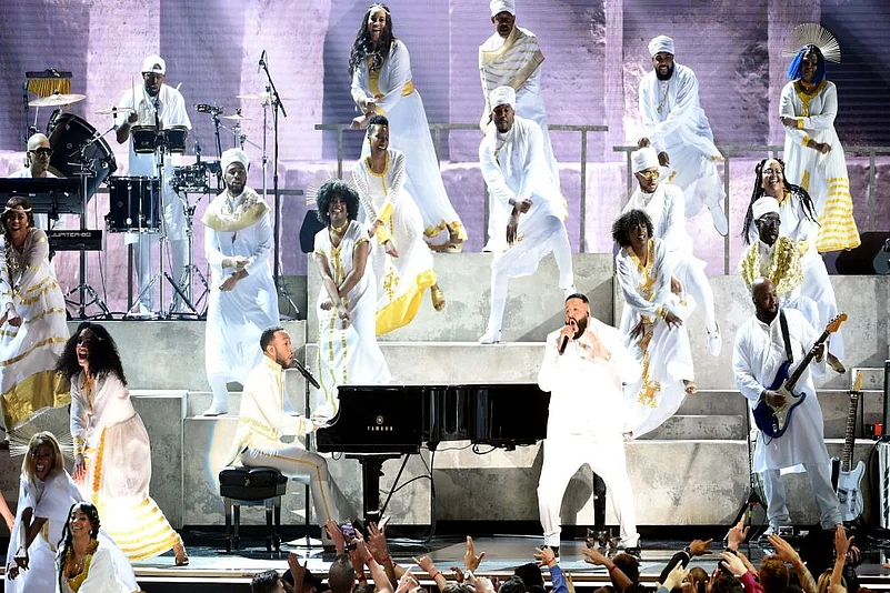 Music artistes John Legend, YG and DJ Khaled performed alongside Meek Mill, Roddy Ricch and Kirk Franklin as part of the Grammy Awards tribute to late activist-rapper Nipsey Hussle here on Sunday.