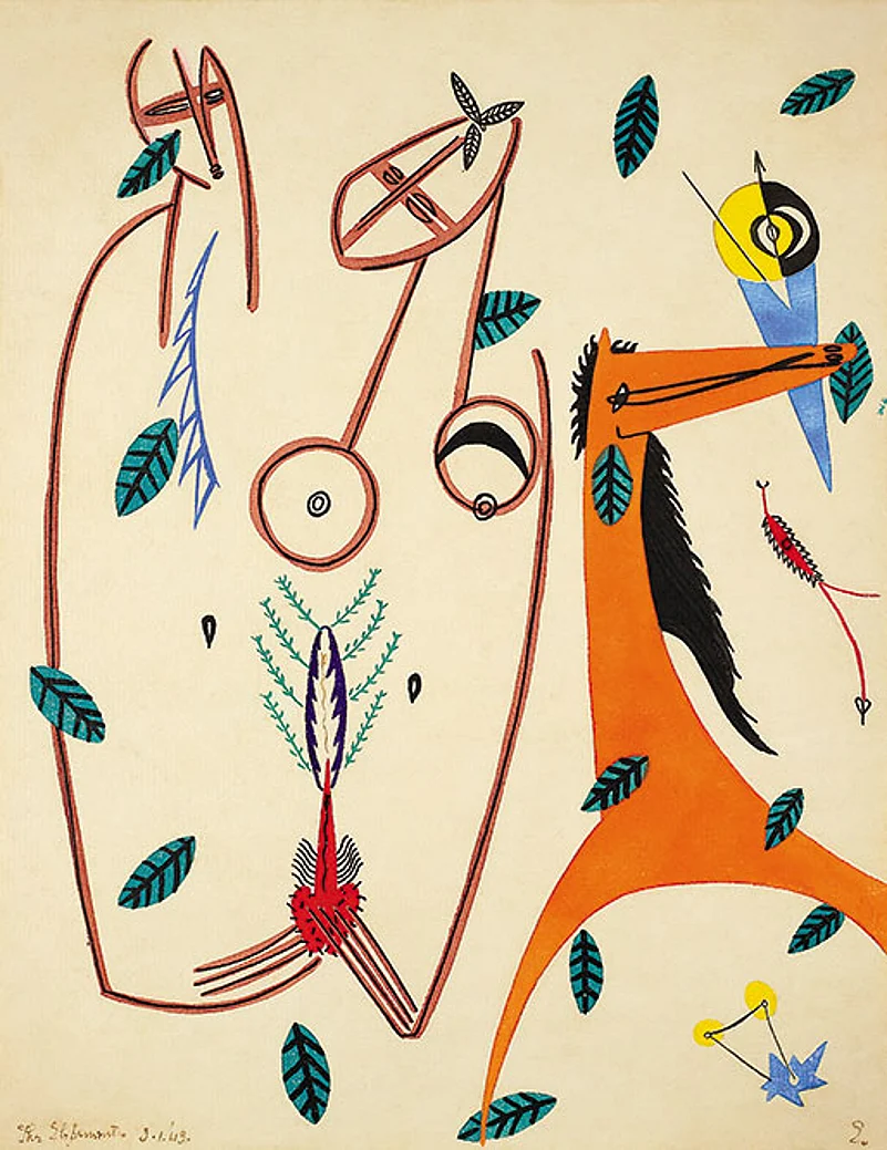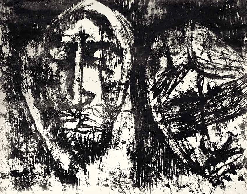 What strikes us most forcefully is how formally accomplished these works are, how robustly they stand up to the passage of time and shifts in taste. During the late 1940s and early 1950s, while still in his twenties, Alkazi drew critically and productively on the then-dominant global artistic preoccupations with Primitivism, myth, and anthropology. Stone Age drawings, West African masks, Mesoamerican sculpture—all these infuse his early work with their energies. While we now regard Primitivism as the articulation of an acquisitive, colonial mentality, it did hold out the promise of transcending the conventional limits of Western art-making during the mid-20th century. How, we may speculate, did a young and already polymathic intelligence like Alkazi’s, drawing on his Arab and his Indian inheritance, embrace and adapt it?