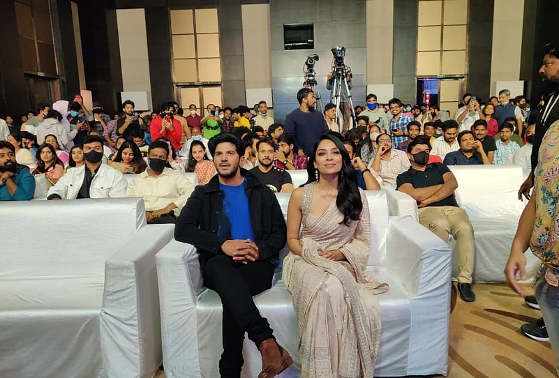 Malayalam actor Dulquer Salamaa and actress Sobhita Dhuipala graced a pre-release event in Hyderabad on Tuesday. Both the actors looked gorgeous as Dhulipala wore a golden saree and Salmaan wore a casual jean, T-shirt and a jacket.