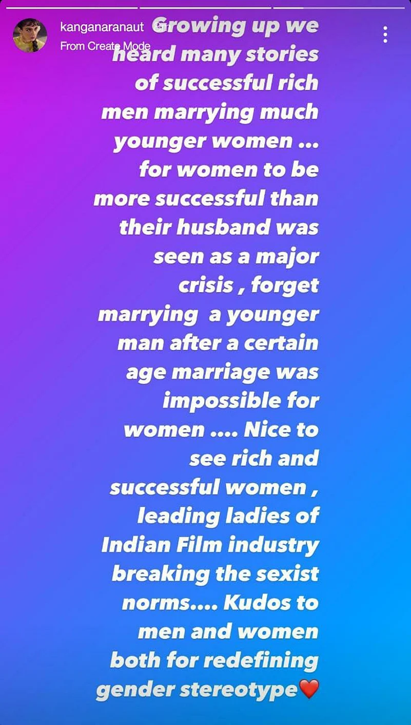 Actress Kangana Ranaut has also indirectly commented on the age-old notions of sexism in marriage, praising Kaif and Kaushal for defying the norms. Kangana Ranaut has praised leading females in the Indian film industry in a recent Instagram story, without mentioning any names.