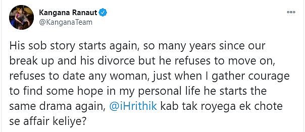 “His sob story starts again, so many years since our break up and his divorce but he refuses to move on, refuses to date any woman, just when I gather the courage to find some hope in my personal life he starts the same drama again, @iHrithik. Kab tak royega ek chote se affair keliye (When will you stop crying over a small affair)?” Kangana wrote in a tweet.