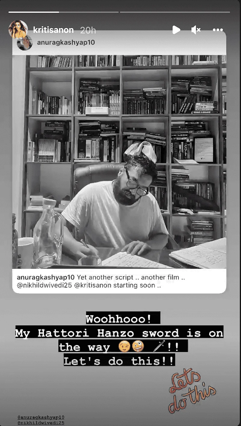 Kriti Sanon also shared Kashyap's post on her Instagram story, with her caption reading: "Woohhooo! My Hattori Hanzo sword is on the way!! Let's do this!!."