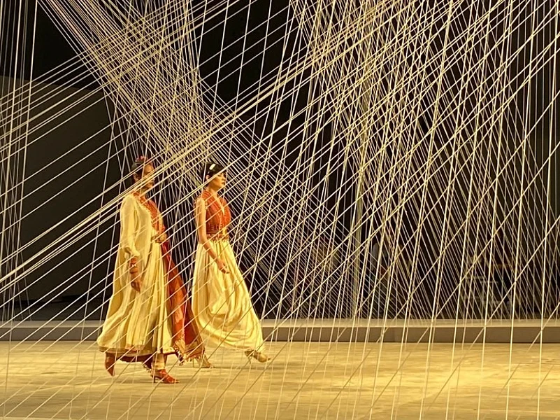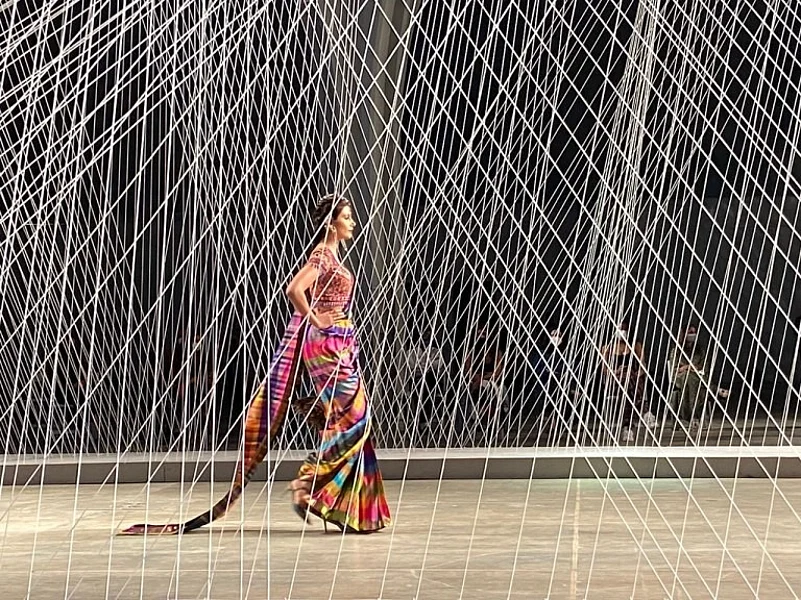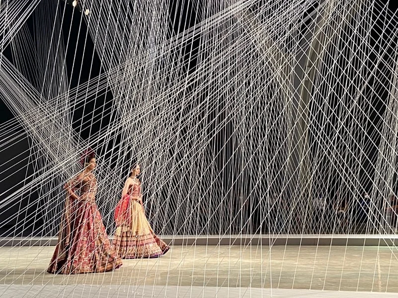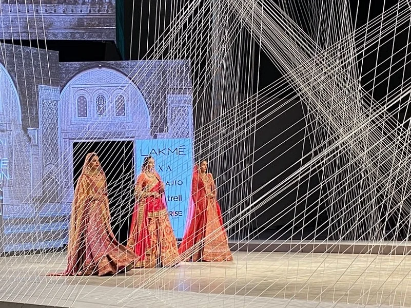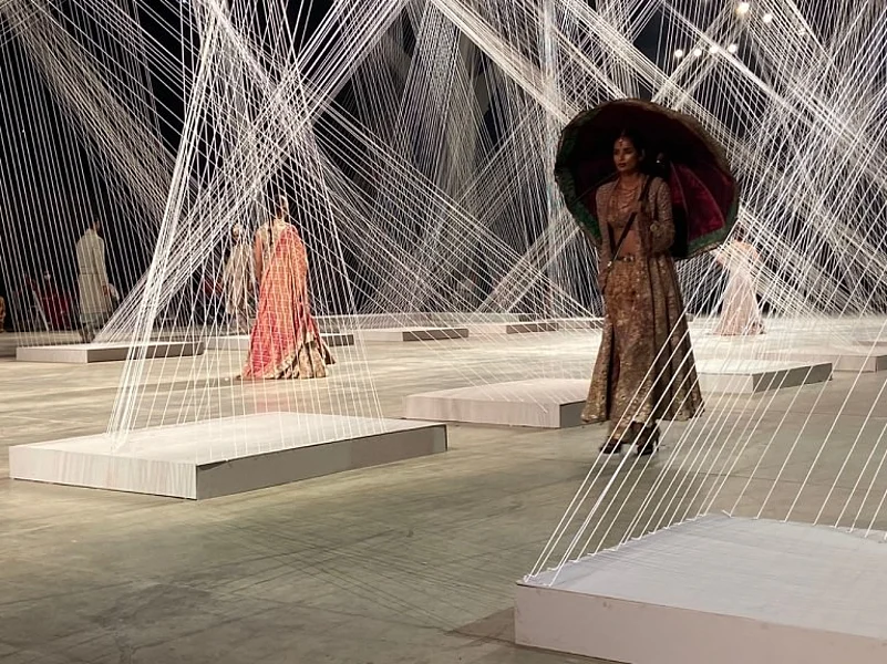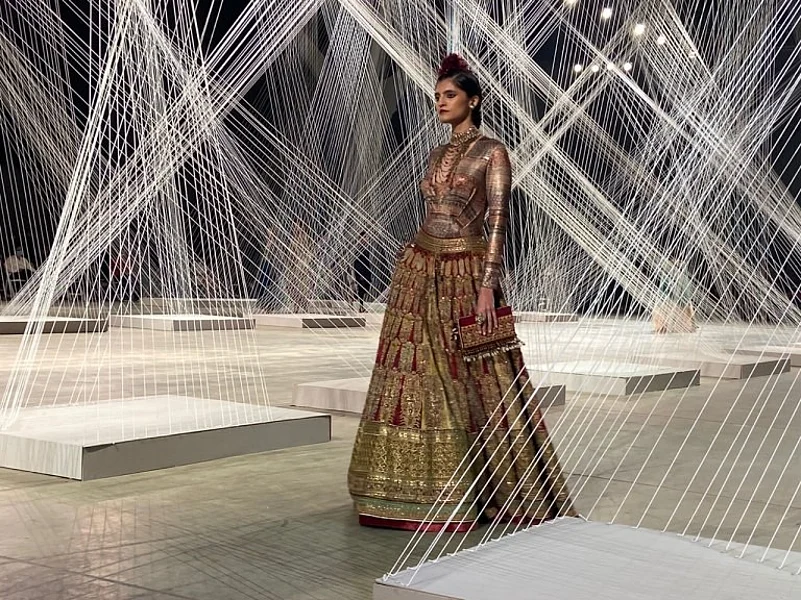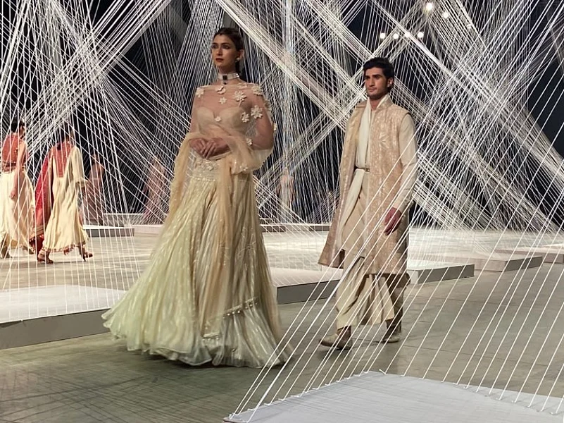 The show began and Tarun Tahiliani's collection, "The Reunion" unfolded its 10 mini capsule collections inspired a range of crafts, textures, art forms, textiles, architecture and motifs from the Rabari Craft, Pichwai art traditions, Chikarkari techniques among others celebrating the richness of Indian heritage traditions. The ramp was decorated with criss-crossed white ropes giving an impression of being held together in difficult times as the pandemic hasnt curled in the claws as yet. But so what? The bridal market continues to be up and about and there has been a popular belief that people never stop shopping for bridal wear and truly so. The capsule collections were presented well with the rich inspirations, techniques and textures backing them but it gave an impression of lacking somewhere in breathability, newness and the idea of 'reinvention' -- a term heavily used by Indian designers and practiced rarely. The accessories, the drapes, the pastels and rich colours, the embroidery, the grandeur in bridal menswear and womenswear was all well and good but where is the change? Why cannot we go beyond embellishments and hiding behind the same time honoured craftsmanship? Why can heritage be presented with simplicity, exposing us to a contemporary take on bridal wear keeping in line with changing mindsets and what the new bride wants? The bridalwear hangover needs immediate attention as we need more than clubbing traditions, techniques and artforms with textiles, textures and crafts. We need a new eye, we need a new view and we surely need a new narrative. We also need easy, simple, accessible and the imperfections that made fashion more than it was supposed to mean. How about imagining the feathers on a bird and interpreting how light it could be rather than adding it to a heavily embellished palette that would bruise the feathers yet again.