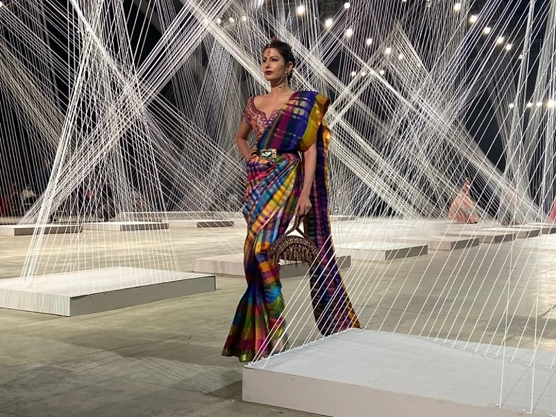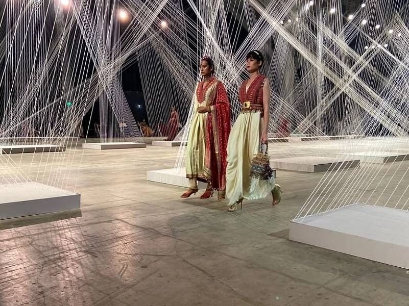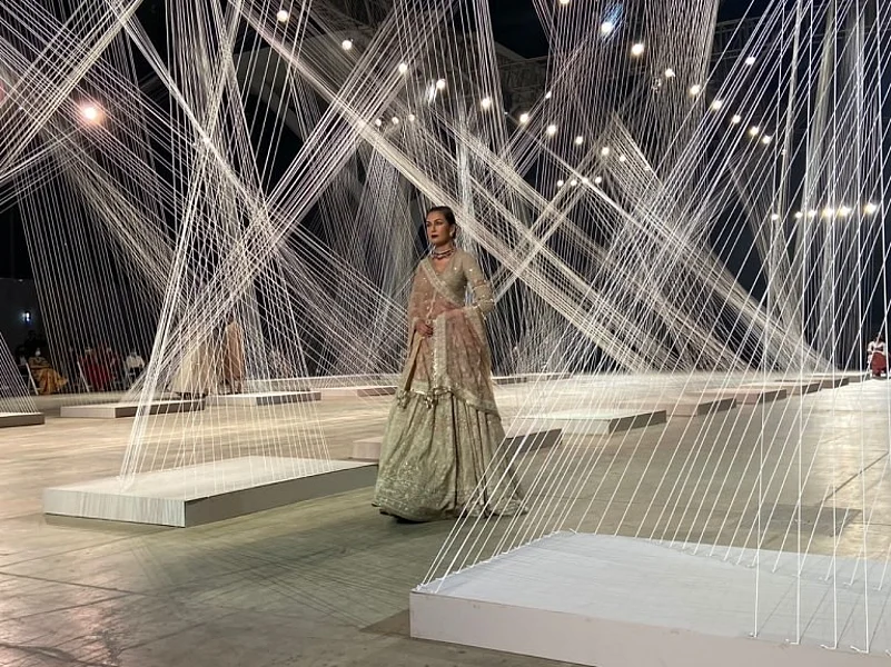 As we got deeper and deeper into the worldwide pandemic, many among us began to realise that the idea of 'physical' changed forever. There was no going back to the old notions of experiencing anything physically in the same fashion that we were accustomed to for many reasons and habits. As I reached the Lakme Fashion Week 2021 venue for its first physical runway show featuring designer Tarun Tahiliani's Autumn-Winter '21 collection called "The Reunion" celebrating fashion and togetherness, it finally hit me that I was physically present at a fashion event after a long time as yearly fashion week ritual had gone virtual in the last couple of years. The happily murmuring attendees hiding their overexcitement and how glad they were to finally catch a physical fashion show , the overprotective security team and volunteers trying to keep everything in order, the faces from the management asking around if we are comfortable at the venue, some familiar faces trying to figure out if they know each other and doing the small talk at distance, it all made sense to what fashion has been needing for sometime now. That is space and structure.