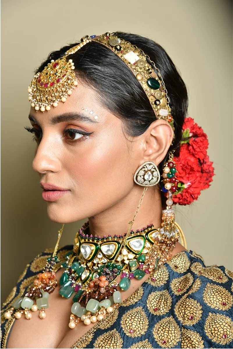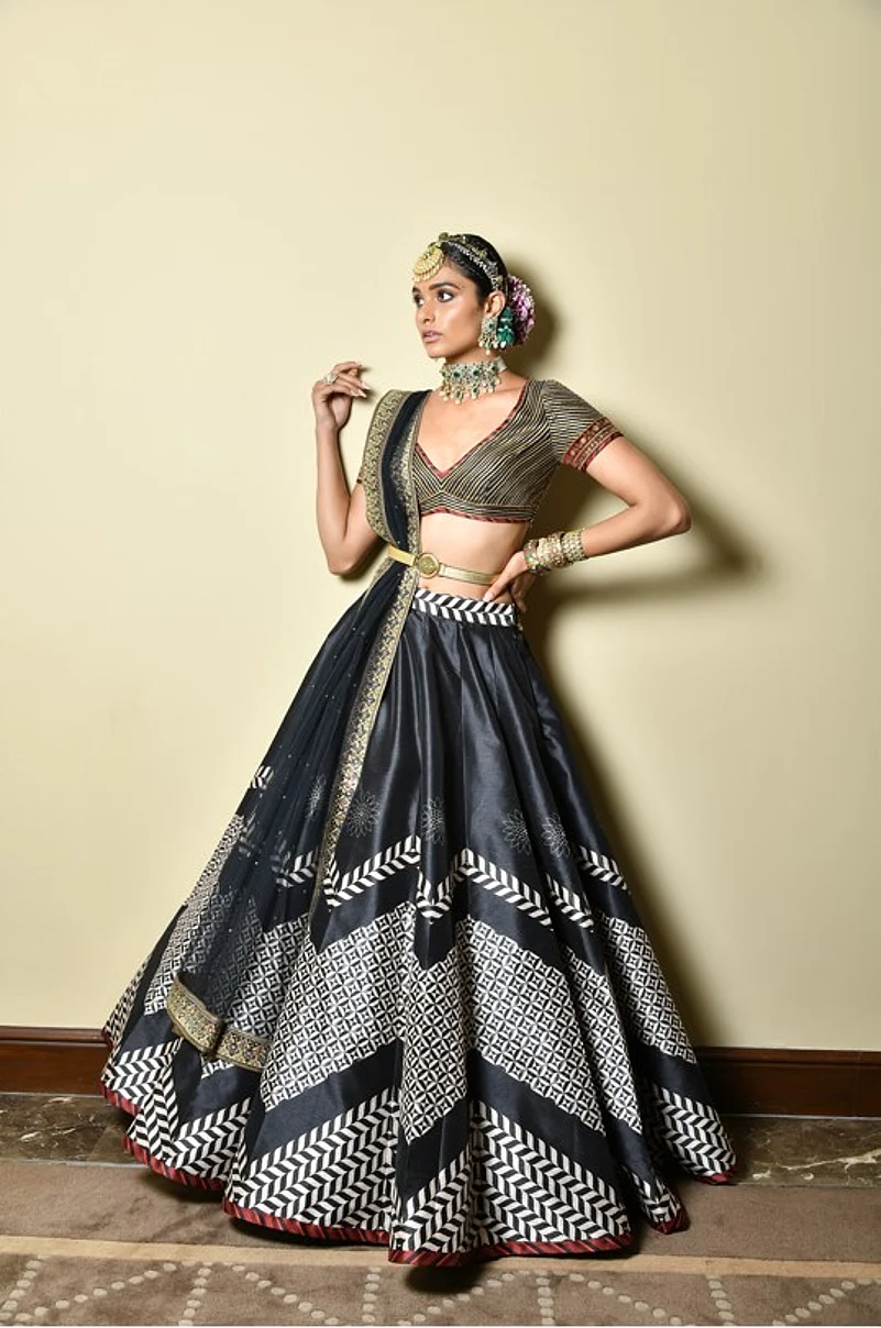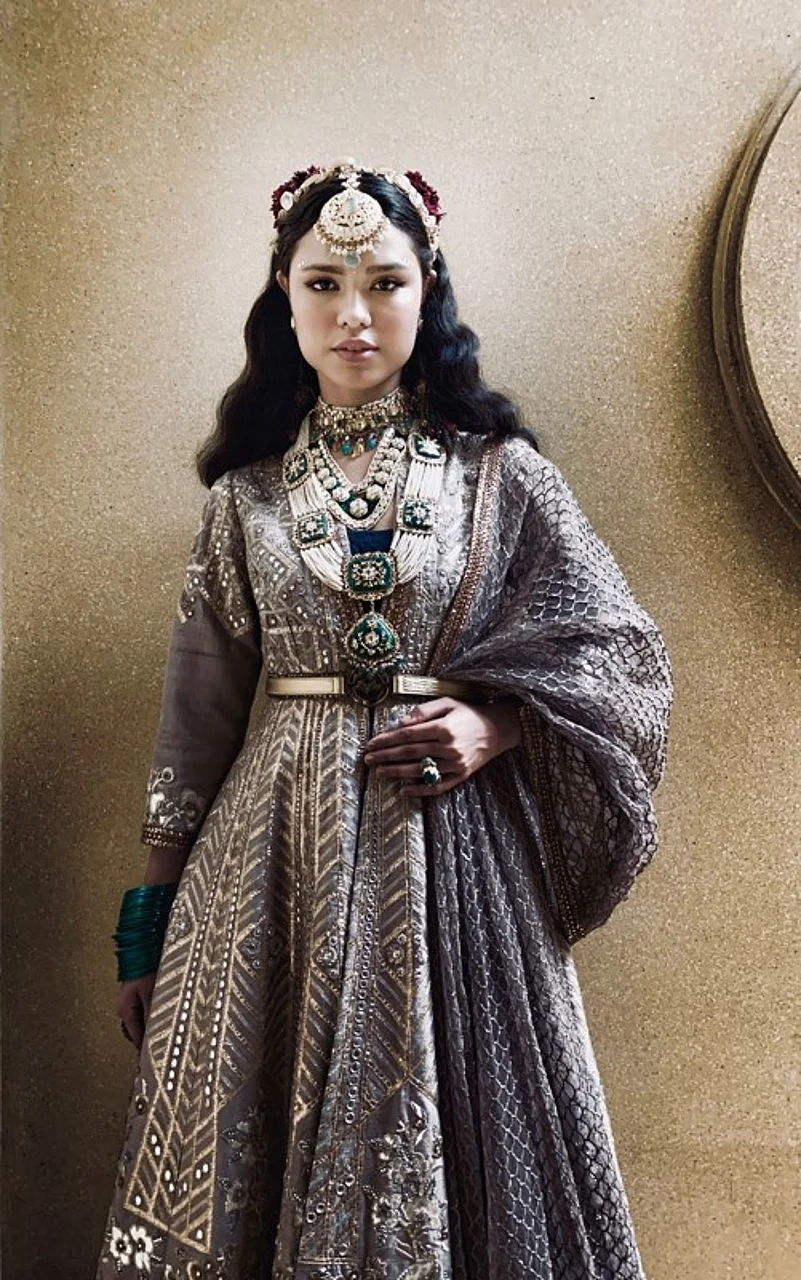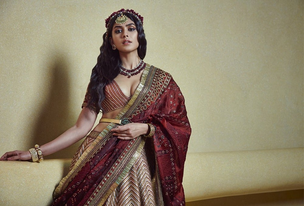 Actress Mrunal Thakur muse for the show looked spectacular in our very special and season’s signature bridal lehenga in silk and organza. Shades of Vermillions and scarlets highlighted with great detail using fine thread work and metalwork with motifs incorporated from the Ottoman Empire but expressed in an Art Deco manner.