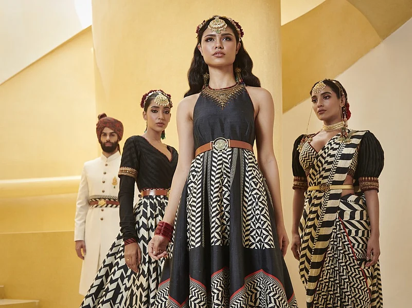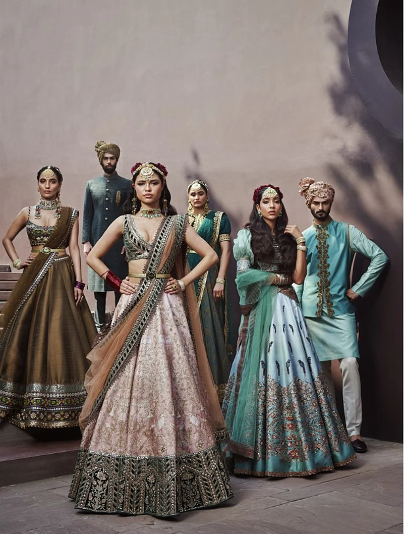 For women, it was magnificent bridal lehengas, cholis and dupattas in stunning red and jewel shades with lavish embroidery. Cholis were eye-catching with illusion yokes, tie-up backs, flirty, sheer, puffed sleeves with ornate cuffs or majestic, encrusted yokes. Tiny boleros, long, floor skimming robes and belted saris added to the grandeur of the look. The regal anarkalis were resplendent as dazzling surface ornamentation with motifs inspired by the days of yore.